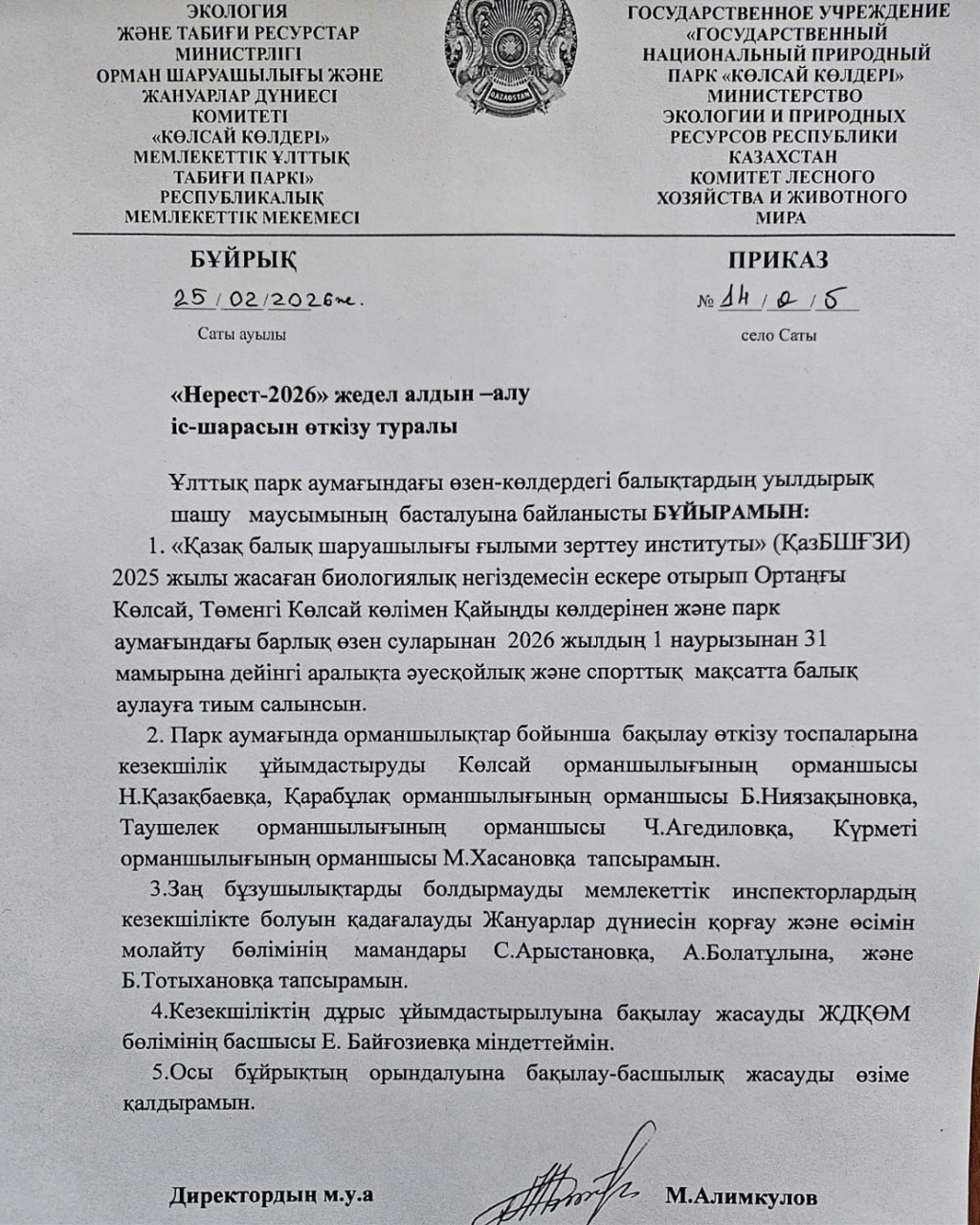 Согласно биологическому обоснованию, составленному Казахским научно-исследовательским институтом рыбного хозяйства (КазНИИСХ) в 2025 году на территории государственного национального природного парка «Көлсай көлдері», с 1 марта по 31 мая 2026 года на озерах Средний Кольсай, Нижний Кольсай, Кайынды и во всех речных водах на территории парка будет запрещен лов рыбы в любительских и спортивных целях.